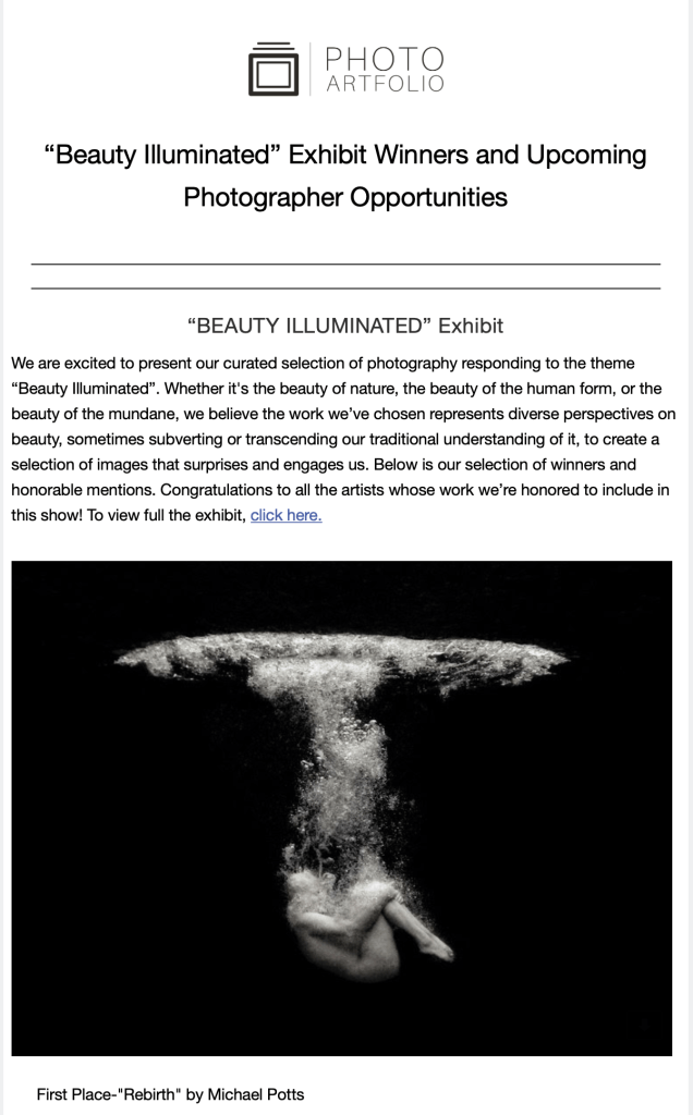 Photo Artfolio has posted their newest online show “Beauty Illuminated” and I am VERY pleased to have received first place with “Rebirth.” I love this picture (and the model within) and I’m so happy it continues to resonate with people.