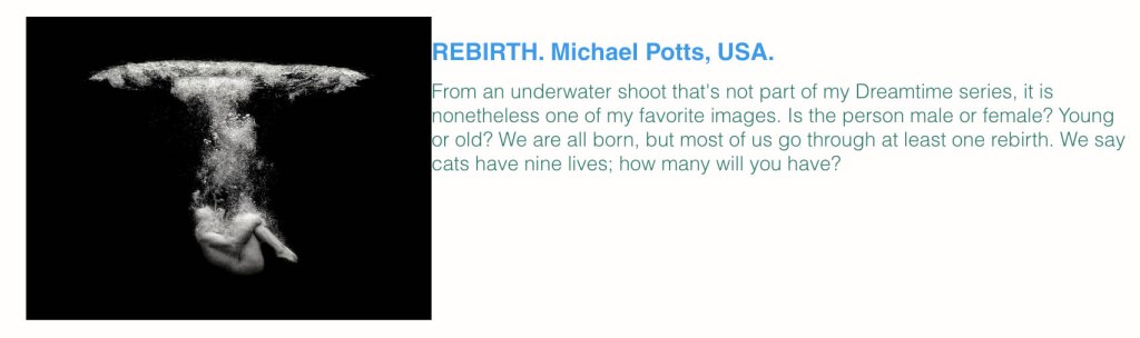 I am pleased to show that Rebirth was accepted as one of many excellent works in the honorable mention category.