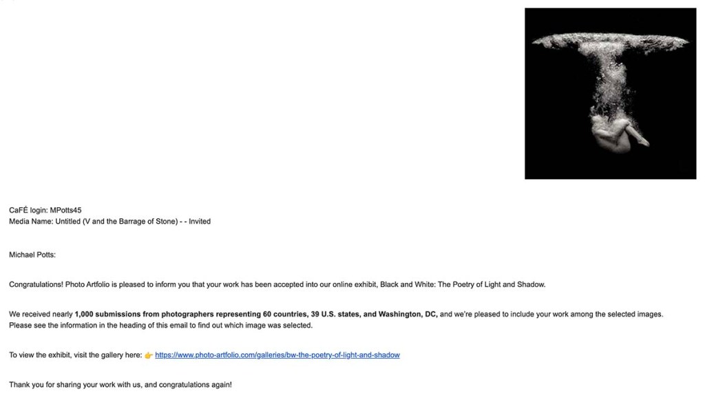 I will confess to some disappointment since in their last black and white show I won first place and the promo image for the current show is mine. But we can’t win all the time : P